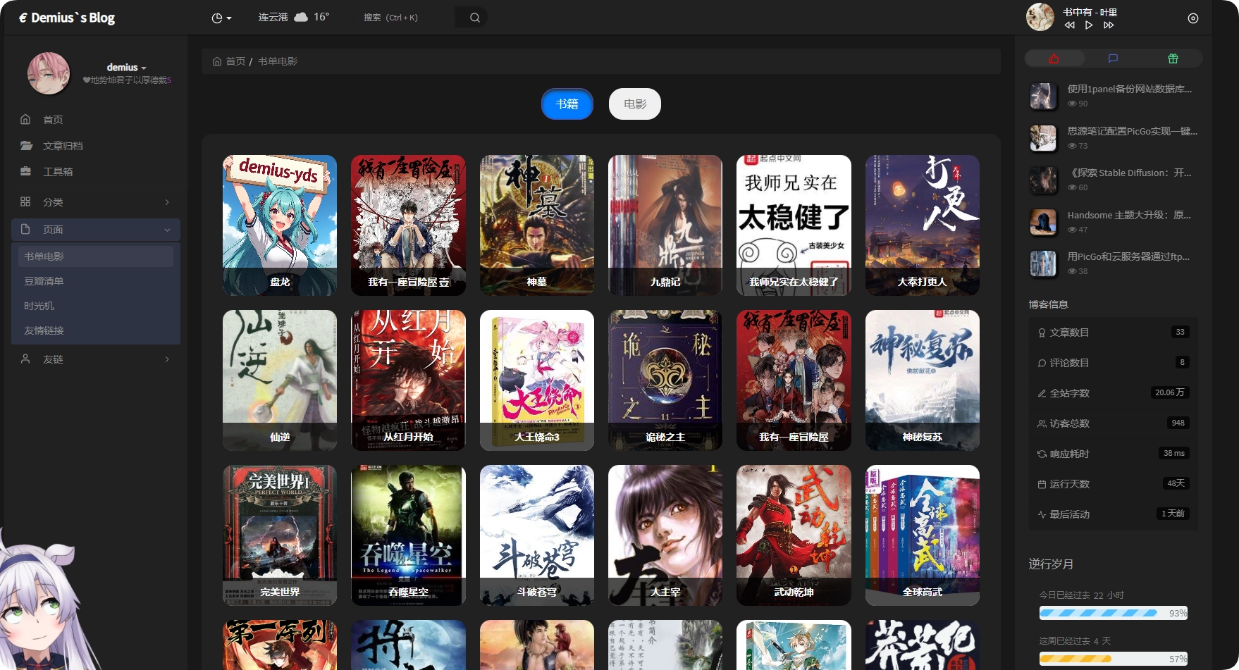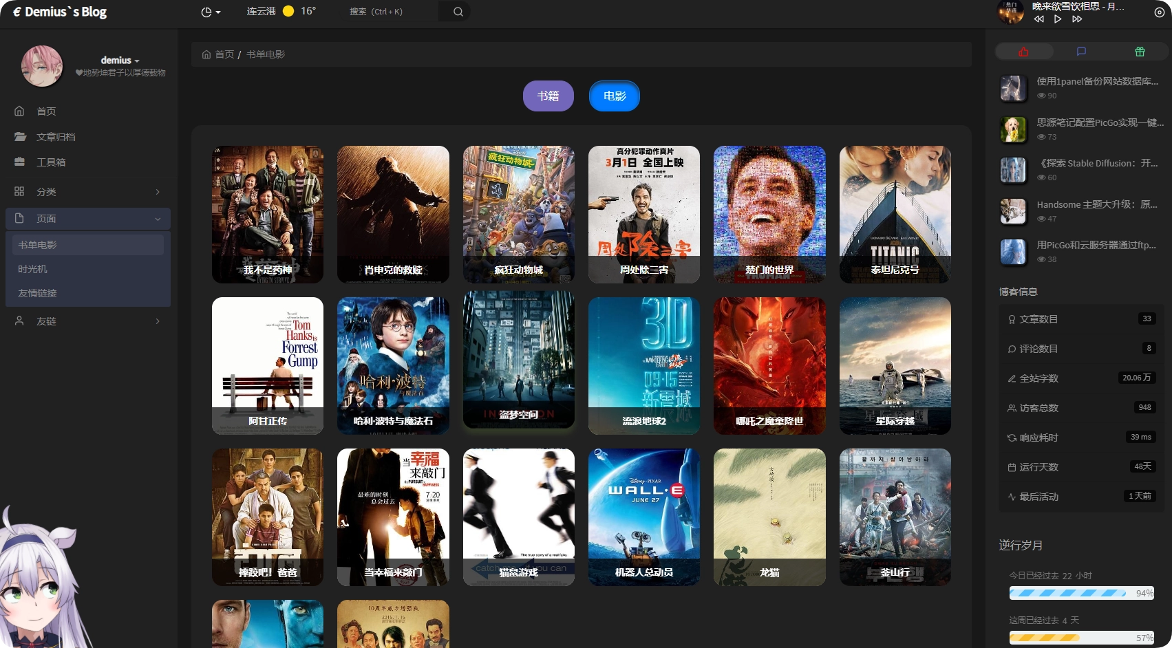 前台点击即可自动读取插件中的书籍与电影信息,这里只展示名称与封面,并不作跳转(原豆瓣书单页面带跳转),目前只在handsome主题使用,未兼容其他主题。